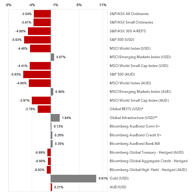 The S&P/ASX All Ordinaries fell 3.5%, moving into negative territory for the year-to-date. Weakness persisted across sectors, with the MidCap 50 and Small Ordinaries indices declining 3.5% and 3.6%, respectively. Utilities gained 1.5% as investors sought defensive assets. Despite solid gains in industrial and precious metals, a 24% drop in the shares of James Hardie Industries, on the back of a significant acquisition announcement, weighed on the Materials sector, which closed 0.3% lower. Information Technology led declines for the second month, ending 9.7% lower, followed by the Consumer Discretionary sector, which fell 6.3%.