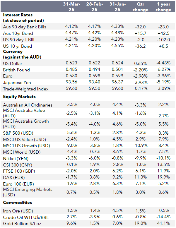 Gold surged 9.6% to close at US$3122/oz, as investors sought a safe haven amid trade and geopolitical uncertainty. Precious metals, including silver and platinum, were also significantly higher, supported by a weaker US dollar. The copper price continued to rise, gaining 12.4%, supported by both Chinese stimulus and the threat of US tariffs on copper imports. Brent crude oil held steady at $72.35 per barrel.